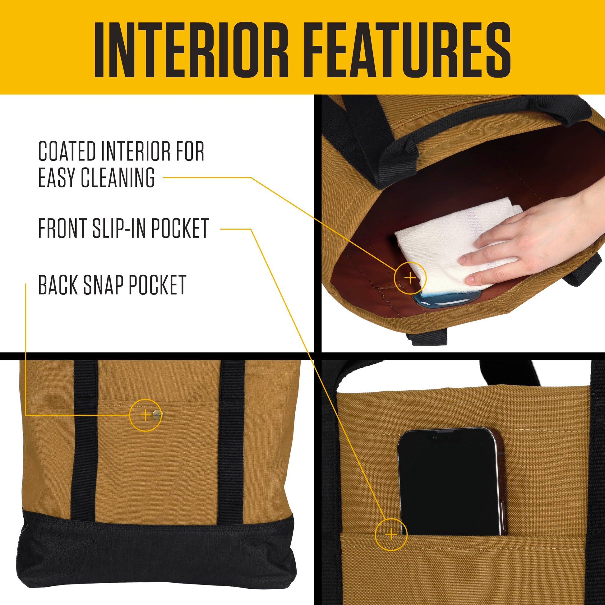 - Coated Interior: The coated interior adds an extra layer of protection against spills and stains, keeping the inside of your tote clean and easy to maintain.