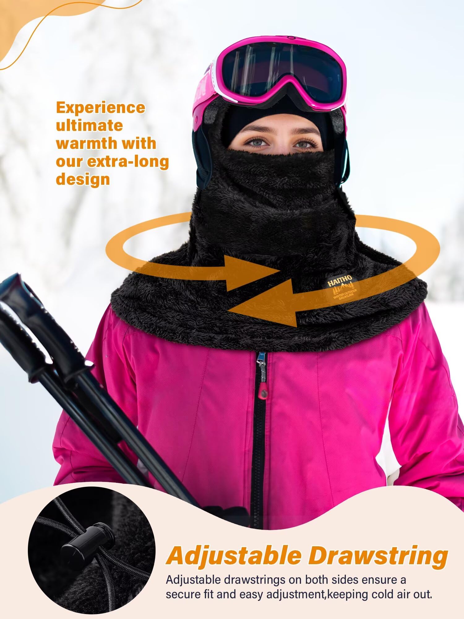 - 【One Size with Adjustable Drawstring】: The balaclava comes in a universal size and is non-elastic but designed with ample space for comfort. An adjustable drawstring at the opening allows you to freely adjust the size according to your needs, achieving a personalized, snug fit. The design makes it suitable for different face shapes and head size, enhancing wind and cold resistance. A must-have winter essential!